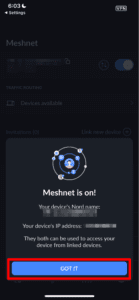 - 最后一个屏幕突出显示了通过其他设备路由流量的风险。我也警告你绝不到将 Meshnet 与您不认识的人的设备一起使用。选择“继续”打开网状网络”。