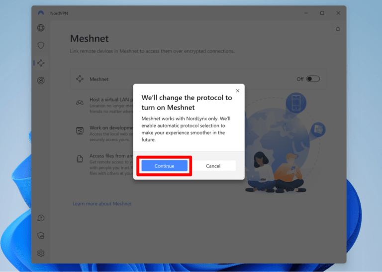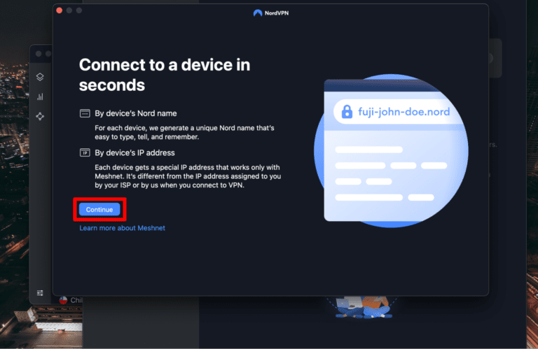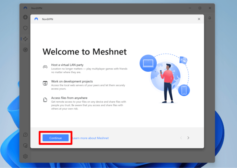 - 了解 NordVPN Meshnet 的各种功能并选择“继续”。