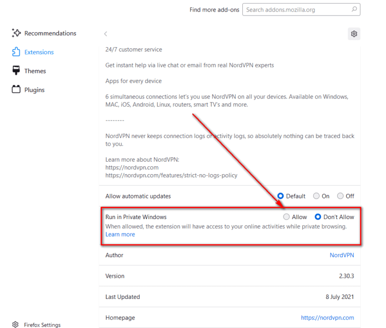 - 向下滚动以找到在私人窗口中运行选项并确保将其设置为允许。