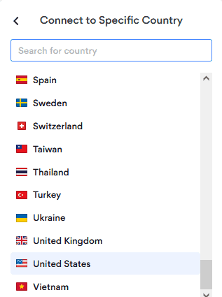 - 如果您想选择特定的服务器,请选择搜索特定国家。