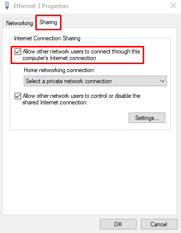 - 点击分享并启用“允许其他网络用户通过此计算机的 Internet 连接进行连接”。