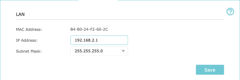 - 进入192.168.2.1在路由器 LAN IP 地址字段中,然后单击“节省”。