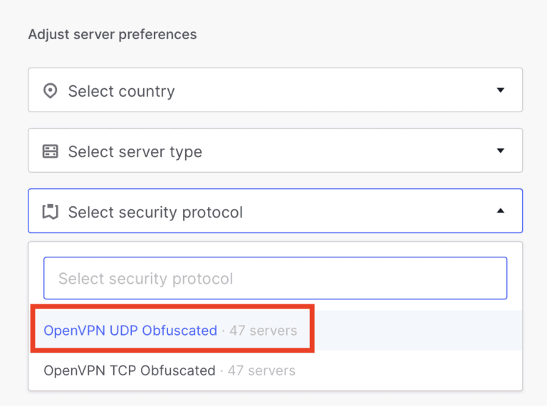 - 在下面 ”选择安全协议,“ 点击 ”OpenVPN UDP 混淆”。