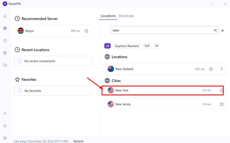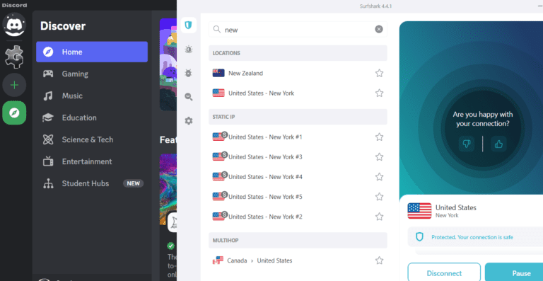 例如,当我访问中国时,我通过连接到 PureVPN 的纽约服务器获得了一个美国 IP 地址来解锁 Discord。