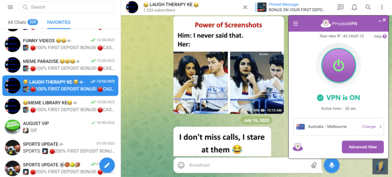它让您可以通过 PC 轻松访问 Telegram 中您最喜欢的模因频道,同时使用手机调情。此外,您还可以与家人和朋友一起使用一份 Surfshark 订阅来访问 Telegram。