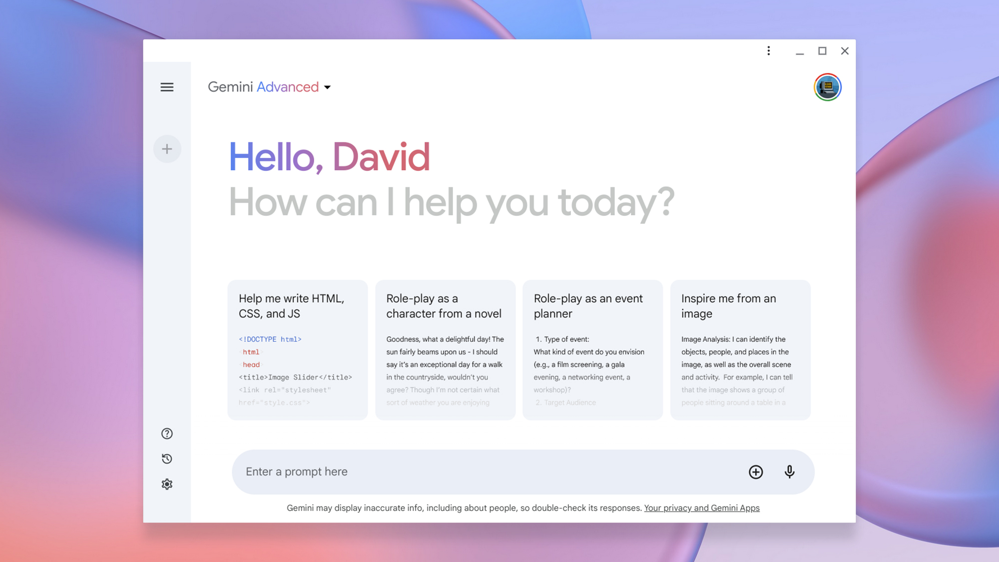 这与您可以访问的 Gemini AI 应用程序相同在网络上通过任何浏览器。如果您以前没有使用过它,它可以生成文本并回答您喜欢的任何主题的问题,从量子物理到小型企业创意。如果您购买的是更复杂的 Gemini Advanced 型号,您可以使用左上角的下拉菜单在它和标准型号之间切换。