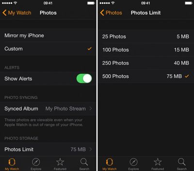 您可以自定义要同步到 Apple Watch 的照片数量,以便更好地控制它们占用的空间。选择 25 到 500 张照片或 5 到 75 MB 的存储空间。