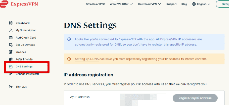 - 单击“注册我的 IP 地址”以获取智能电视的 DNS 设置。