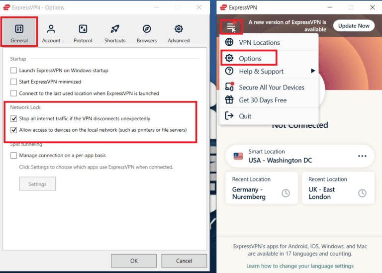 - 启用网络锁定终止开关,以防止 IP/DNS 意外泄漏到 Amazon Prime Video。点击汉堡菜单图标>选项>网络锁设置(在常规类别下)>查看“停止 VPN 中的所有互联网流量意外断开”。