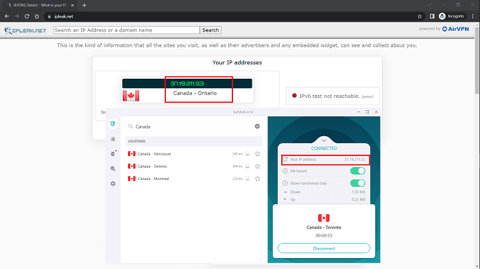 - 测试是否有泄漏。访问 ipleak.net 并查看您的设备是通过加拿大 IP 还是您的实际 IP 进行传输。在后一种情况下,请断开连接并重新连接。