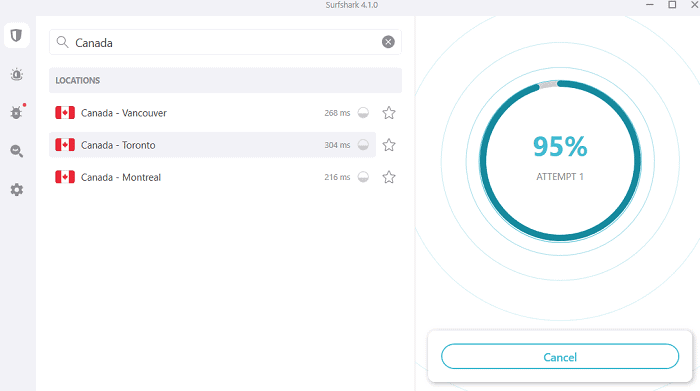 值得庆幸的是,Surfshark 在三个城市拥有数百个加拿大 IP 地址,并提供可靠的加密。因此,如果您无法通过任何其他加拿大服务器解锁 CBC,您始终可以连接到另一台服务器。