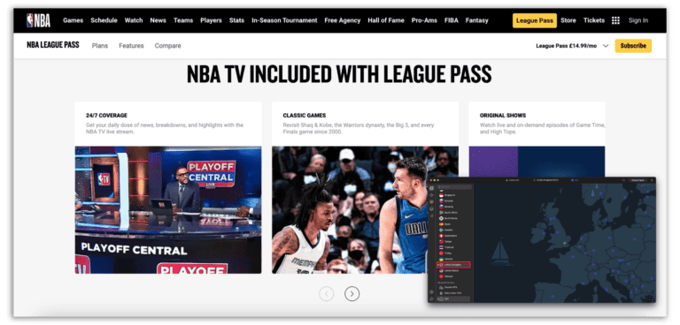 如果您居住在英国,您可以通过 NordVPN 通过英国服务器观看 NBA League Pass美国和加拿大,由于转播权的原因,直播比赛停电的情况很常见。