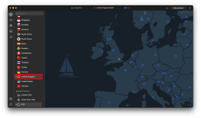 - 连接到美国或加拿大境外的服务器。您可以通过点击屏幕左侧面板上的任何国家/地区来完成此操作。我选择了英国服务器。