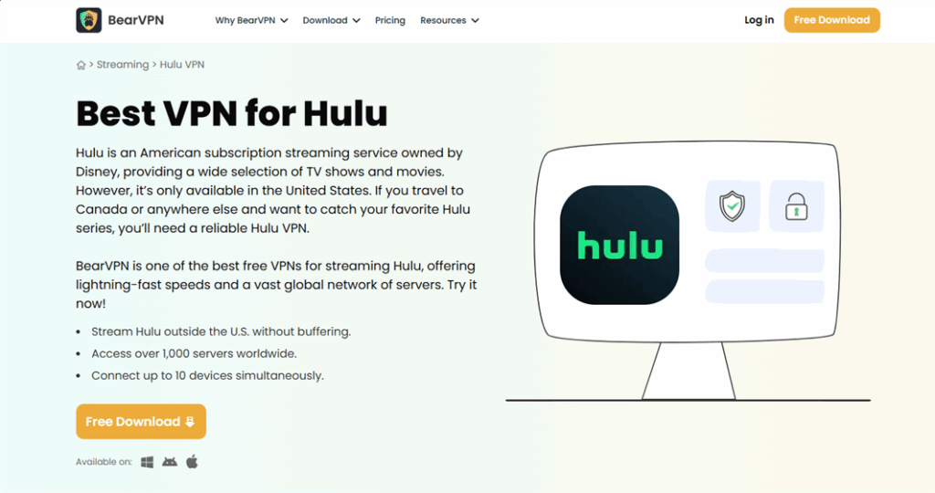 简而言之,BearVPN 结合了旋转 IP、防泄漏、智能路由和自适应加密,以保持对 Hulu 的稳定、私密访问。虽然没有任何 VPN 可以保证永久绕过,但 BearVPN 的设计比典型 VPN 具有弹性、透明性和更流畅的流传输能力。