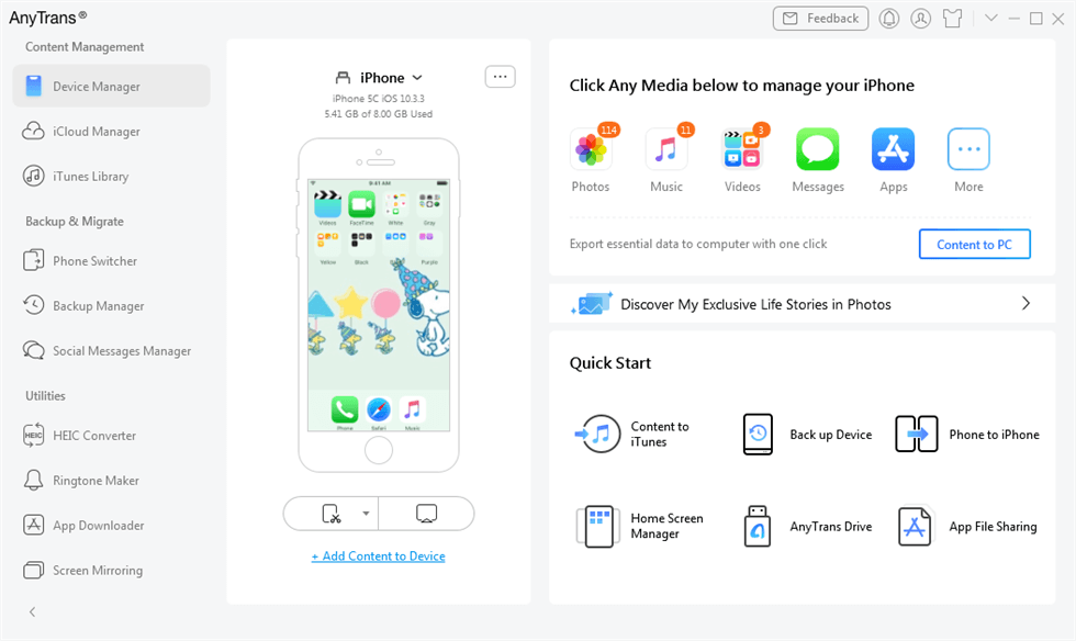 如果您用尽了之前的所有方法都没有成功,那么是时候向您介绍一个特殊的解决方案,AnyTrans! AnyTrans 是一款多功能 iOS 数据传输工具,可简化您的电脑和 iPhone 或两部 iPhone 之间的 iBooks 传输。这是解决 iBooks(而非下载问题)的首选选项。让我们深入探讨一下为什么 AnyTrans 是您的最终选择: