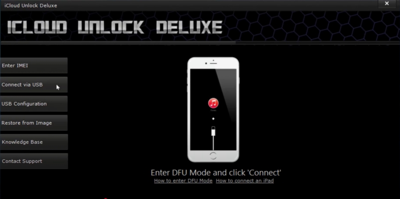 步骤1。启动 iCloud Unlock Deluxe 软件并使设备进入恢复模式。然后链接您的设备和计算机并单击通过 USB 连接。