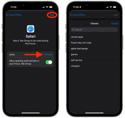 - 点击您想要包含在此焦点中的选项卡组,然后点击添加在上一个屏幕上。