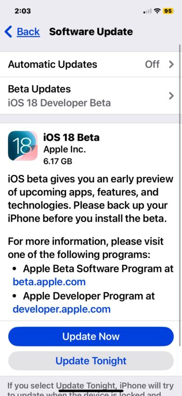 - 点击返回,然后点击“立即更新”以下载并安装 iOS 18 beta 1 / iPadOS 18 beta 1