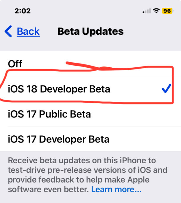 - 点击“Beta 更新”并选择“iOS 18 Developer Beta”