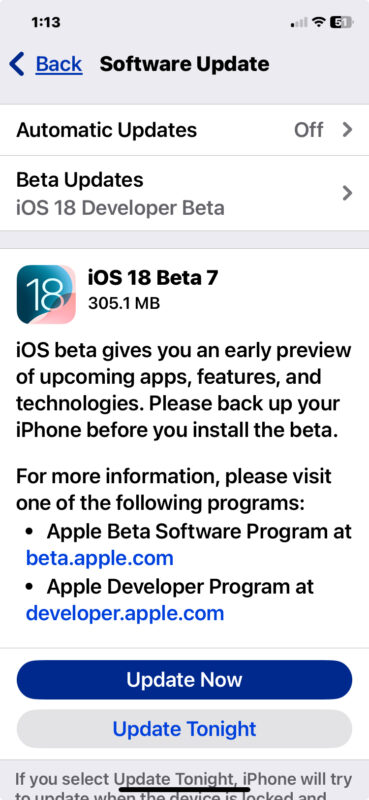 - 选择“立即更新”以在该设备上下载并安装 iOS 18 beta 7 或 iPadOS 18 beta 7
