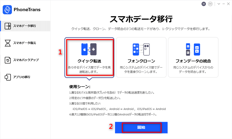如果上述方法无法解决转移到新iPhone无法使用的问题,并且您想要更简单、更快捷的方式来设置您的iPhone,PhoneTrans将为您解决繁琐的步骤。作为一款专业的手机到手机传输工具,它提供了三种传输模式来设置您的新 iPhone 15。