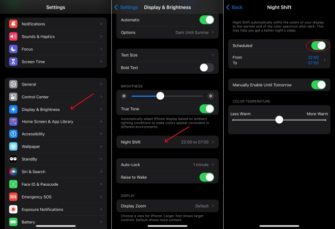 Night Shift 功能通常会将您的 iPhone 屏幕颜色转为暖色调,以减轻眼睛疲劳。因此,关闭 Night Shift 选项将帮助您解决黑色背景问题。