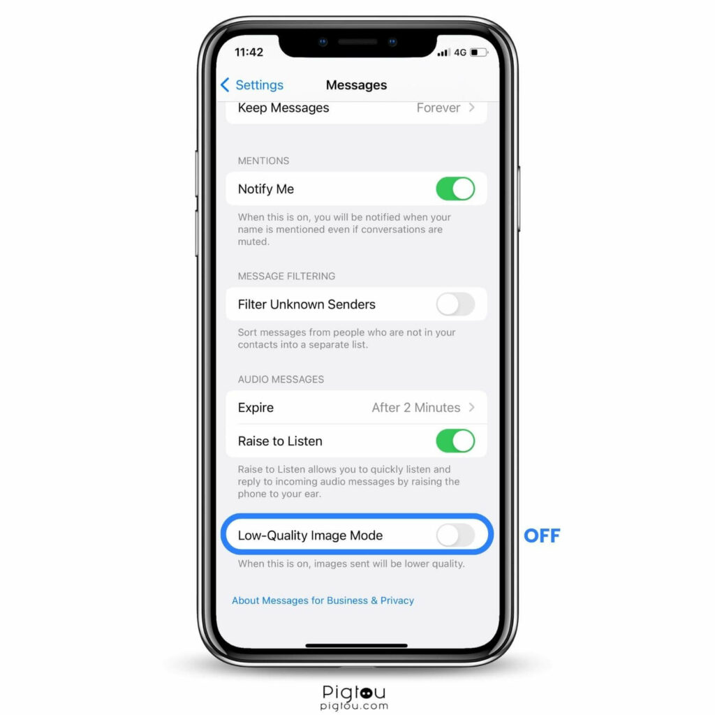 如果您发送的照片通过但质量较低,请尝试关闭“低质量模式”在发送和接收图片的两部手机上。