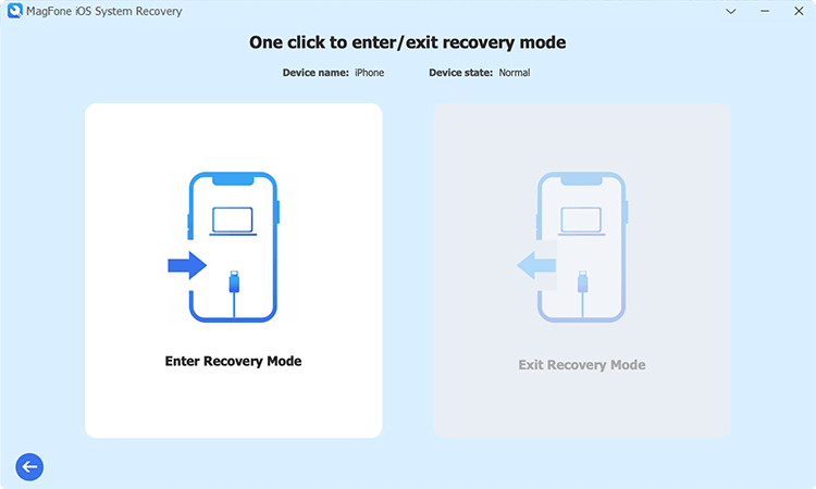 首先在计算机上打开 MagFone iOS System Recovery,然后使用 USB 数据线连接您的 iPhone。在主界面上,选择进入/退出恢复模式选项。