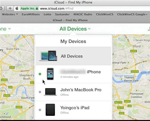 步骤3。单击您丢失的设备。如果您幸运并且设备仍然在线,则可以在地图上看到它。但是,如果“查找我的iPhone”无法找到您的设备,您将看到最后一个已知的位置。