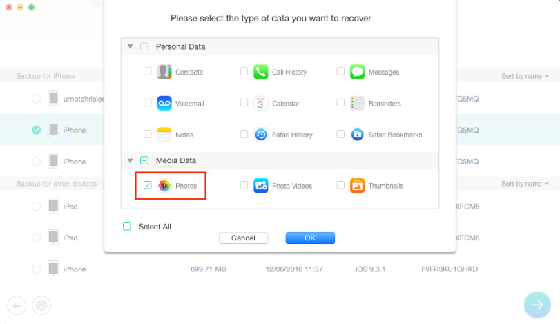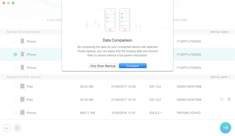 步骤2。选择备份,扫描备份数据(例如照片)。比较是为拥有iPhone的用户准备的,该用户将将iPhone上的数据与备份进行比较。如果您丢失了iPhone,则无需点击比较按钮。