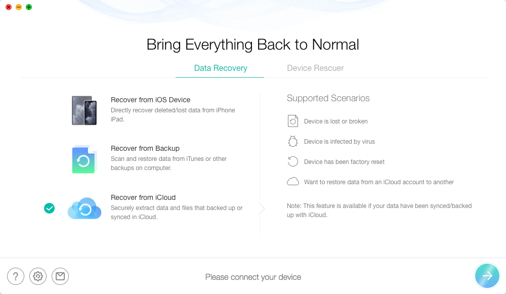 步骤1。为iOS运行PhoneRescue,然后从iCloud模型中选择恢复。
