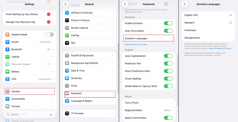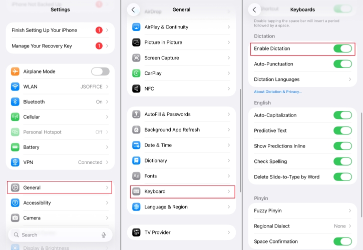 有时iPhone用户无意中关闭了听写功能,或者清除了一些下载的语言文件,这可能会导致语音转文本无法工作。