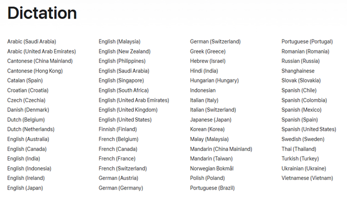 Apple 在 iOS 12 及更高版本上支持听写,但并非支持所有语言。