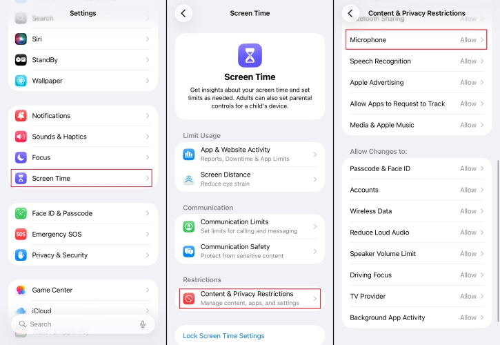 有时,问题是由于屏幕时间设置禁用了麦克风或听写功能造成的。如果您已开启相关限制,则需要勾选并关闭限制才能恢复语音转文字的正常使用。