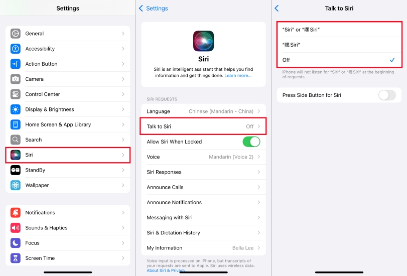 步骤 3.设置与 Siri 交谈并决定是否允许按 Siri 的侧面按钮。