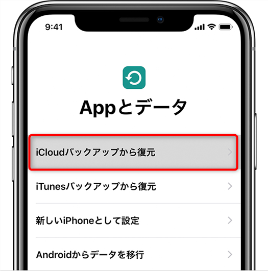2. 设置新的 iOS 设备(例如 iPhone 或 iPad)。在设置过程中,当出现初始设置屏幕时,选择应用程序和数据迁移 -> 从 iCloud 备份恢复。