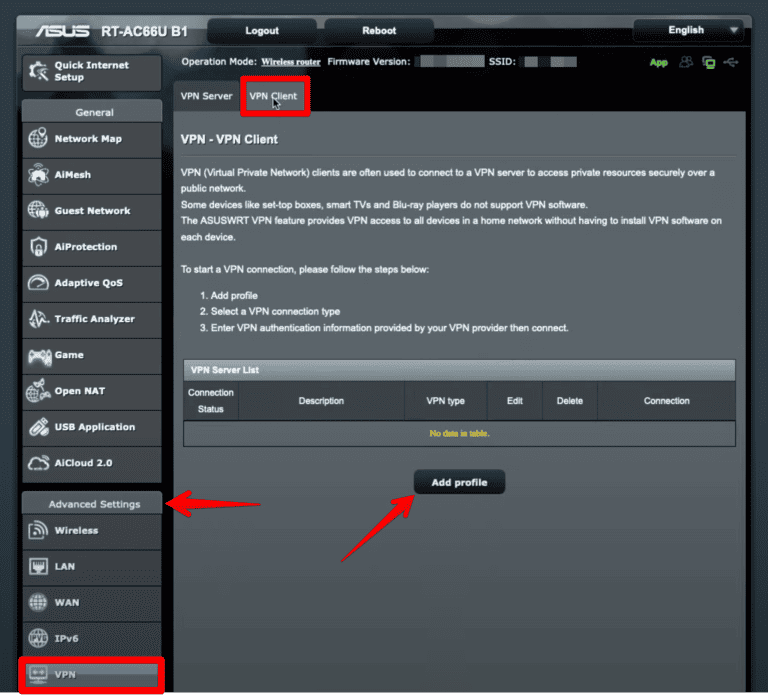 - 登录路由器的管理面板并转至VPN 选项卡 > VPN 客户端 > 添加配置文件。