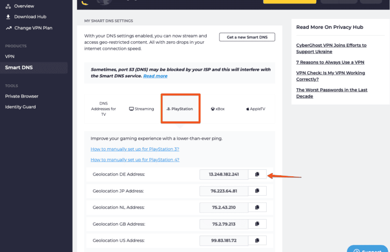 CyberGhost还提供了一个方便的智能DNS该选项可简化任何游戏机上的 VPN 安装。然而,SmartDNS 不包括加密,因此虽然安装速度很快,但它不会对 DDoS 攻击进行报复。