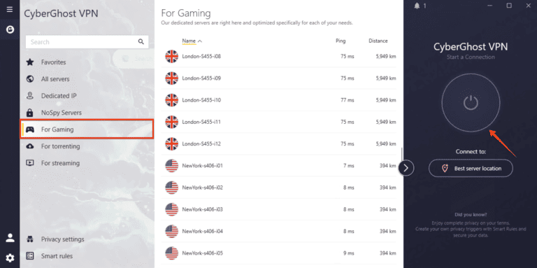 距离您所在位置最近的 CyberGhost 服务器是最好的游戏服务器,因为它可以提供最佳的 ping 和延迟。如果您想解锁区域锁定的 DLC 或加入外国大厅,我建议您只连接到距离您最远的服务器。
