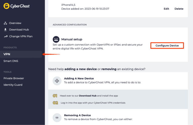 - 前往 CyberGhost 网站并访问下载中心 > VPN > 手动设置。