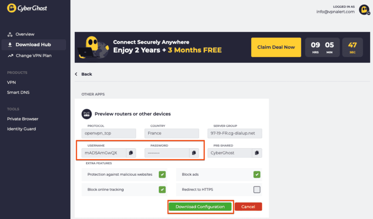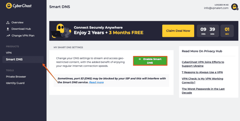 - 打开 CyberGhost 网站并转至账户概览 > 智能 DNS