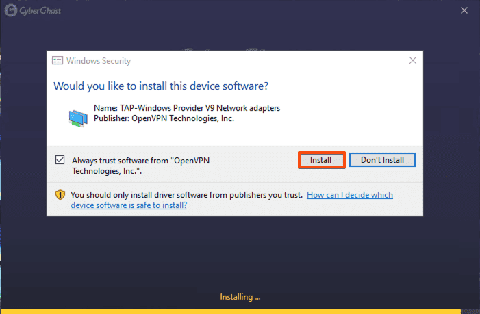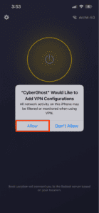 - 允许 CyberGhost 添加 VPN 配置。对于 Android 用户,请在出现提示时批准连接请求。