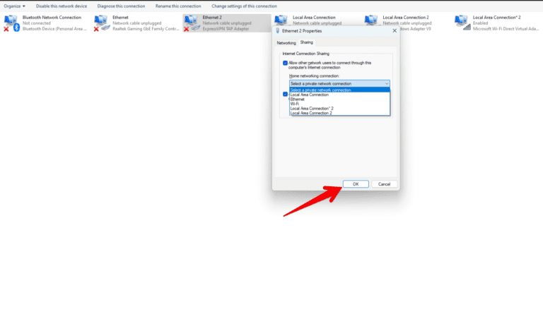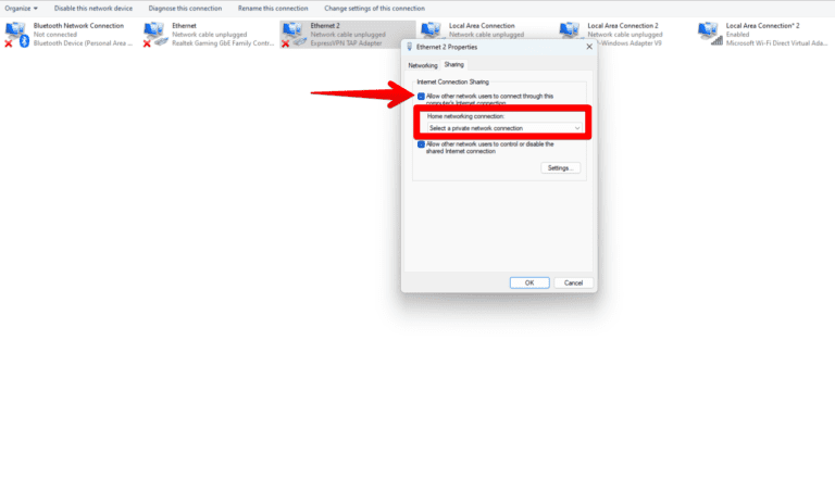 - 转到“共享选项卡”在网络属性下并检查“允许其他网络用户通过计算机的连接进行连接“ 盒子。