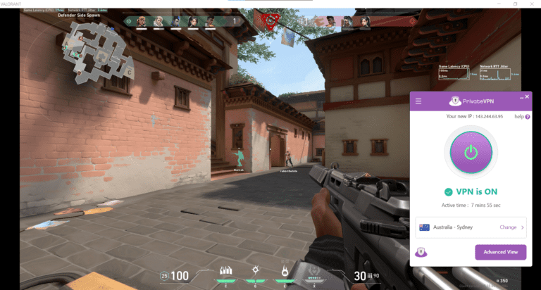 为了测试 PrivateVPN 的功能,我使用其澳大利亚服务器玩了《Valorant》,运行情况令人满意。然而,有时会有一些延迟下降。