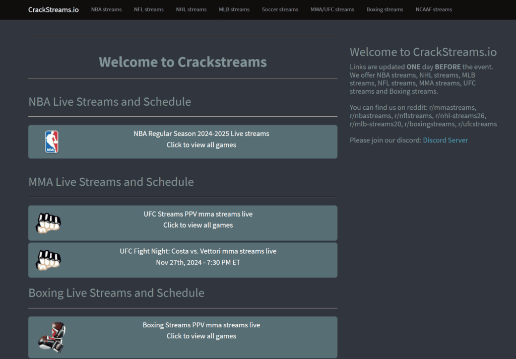 CrackStreams 为 UFC 和拳击提供高质量的流媒体,并具有社区互动功能。然而,大量的广告、由于法律压力导致的频繁域名变更以及可靠性问题使其成为一个有风险的 StreamEast NFL 替代选择。