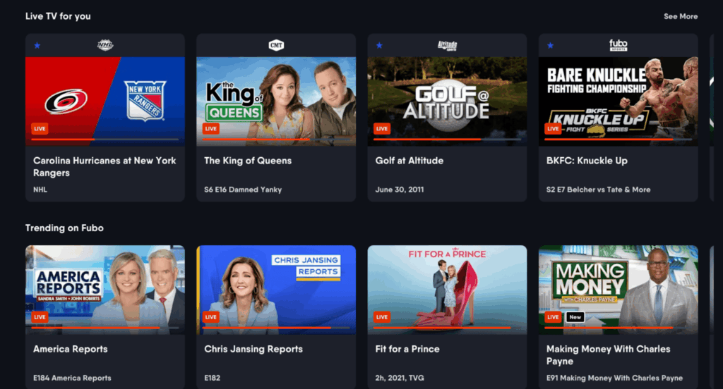 体育报道:fuboTV 提供最全面的体育频道阵容,包括 ESPN、FS1、NBC Sports、CBS Sports、NFL Network 以及针对当地 MLB、NBA 和 NHL 球队的区域体育网络。