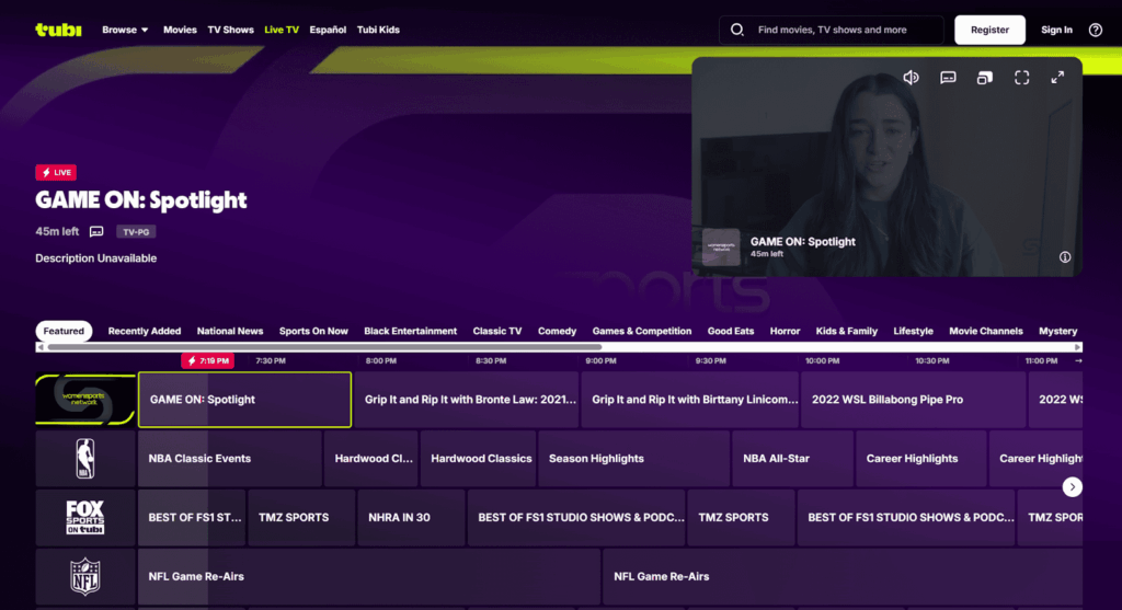 体育报道:Tubi 提供体育频道和赛事的访问,涵盖 NFL、NBA、MLB、NHL、UFC 和 PGA 巡回赛内容。