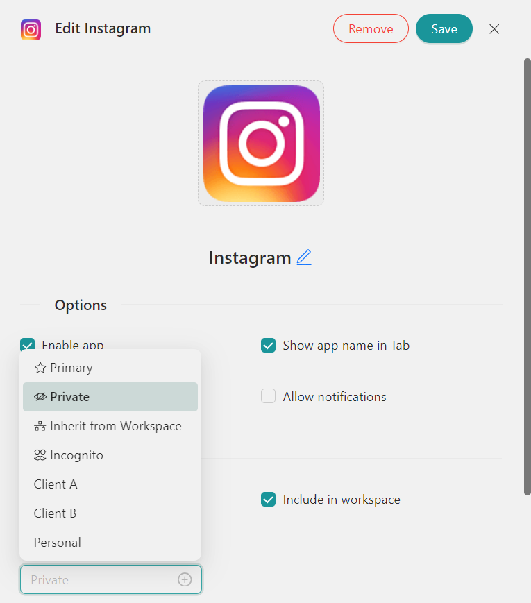 - 配置应用程序设置根据您的喜好。请记住,您可以选择要在应用程序中使用的配置文件(从工作区继承、主要配置文件、私有配置文件、隐身配置文件或自定义配置文件)。