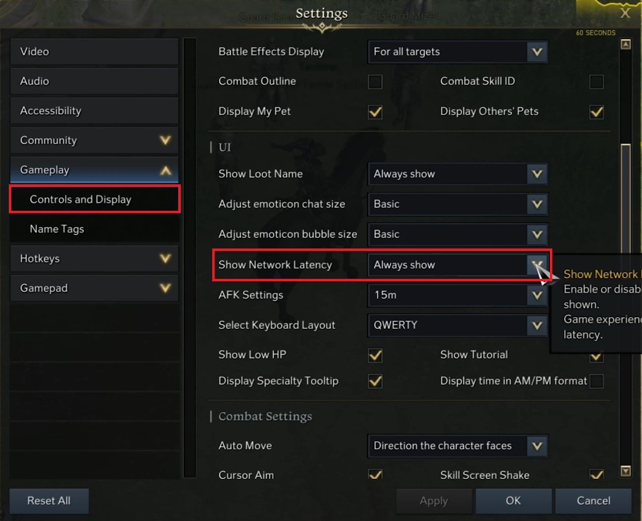 如果您想看潜伏期或者ping到您当前的服务器,然后导航到您的游戏内设置。在游戏玩法标签,下控件和显示,确保向下滚动到UI部分并更改显示网络延迟环境。将此选项设置为总是显示,您可以预览您正在播放的服务器的ping或延迟。