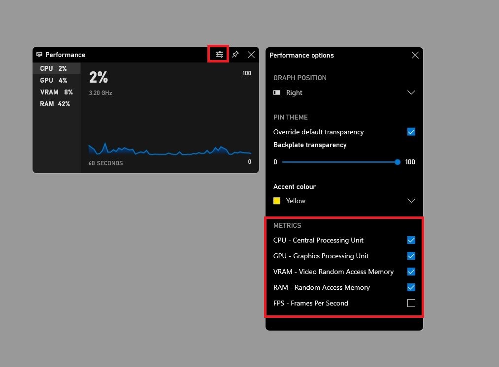 固定窗户并选择最佳位置之前,请打开您的性能偏好。选择最佳的图形位置;我们喜欢使用100%及以下的透明度,启用或禁用您希望看到的一些指标。您还可以更改覆盖颜色。确保在游戏中使用鲜艳的颜色来查看它。